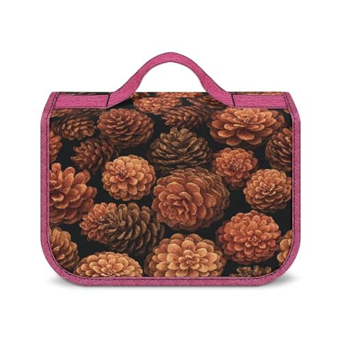Trousse de Toilette de Voyage pour Femme, Motif Pommes de pin Orange et Marron, avec Crochet pour shampoing.