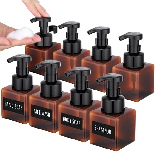 Segbeauty Distributeur Savon Mousse, 8 Pièces Flacon Pompe Vide 250ml, Flacon Mousseur Vide, Bouteille Shampoing en Plastique avec Etiquettes (Marron)