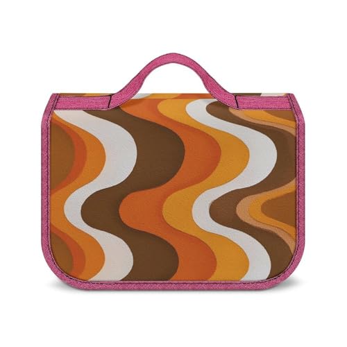 Trousse de Toilette de Voyage pour Femme, Motif Vagues rétro Orange, Marron et Blanc, avec Crochet pour shampoing. Organisateur de Maquillage Suspendu.
