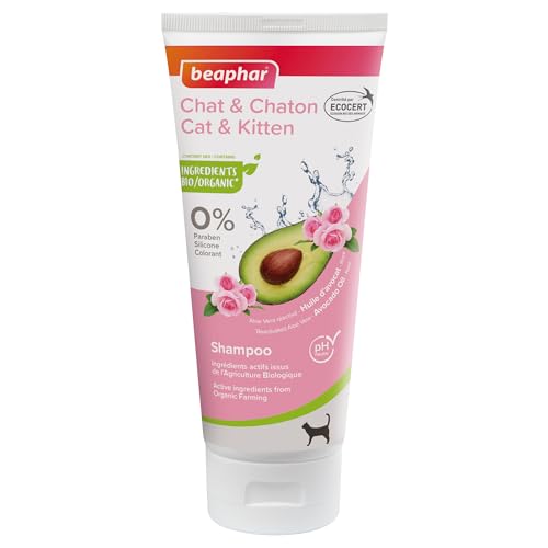 BEAPHAR – Shampoing Éco-certifié pour chat et chaton – Contient de l'Aloe Vera, de l'huile d'Avocat et de la Rose Bio – pH neutre – Sans parabène, sans silicone, sans colorant et sans alcool – 200 ML