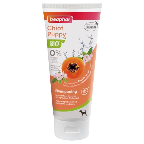BEAPHAR – Shampoing labellisé ECOCERT pour chiot – Contient de l'Aloe Vera, des Fleurs de Cerisier et de la Papaye Bio – pH neutre – Sans parabène, sans silicone, sans colorant et sans alcool – 200 ML