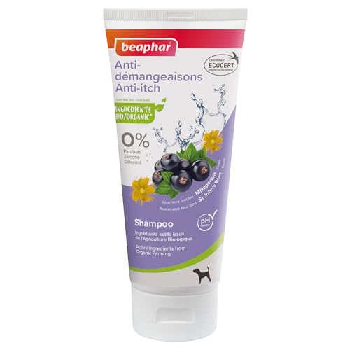 BEAPHAR – Shampoing Anti-Démangeaisons labellisé ECOCERT pour Chien – Contient de l'Aloe Vera, du Millepertuis et du Cassis Bio – pH Neutre – sans parabène/Silicone/Colorant et sans Alcool – 200 ML