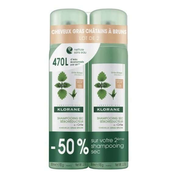 Klorane Shampoing Sec Séboréducteur à l Ortie Le teinté Cheveux gras châtains à bruns Offre spéciale Duo 2X150ml