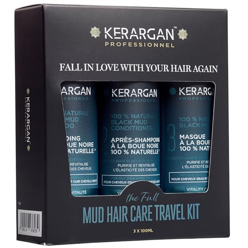 Kerargan - Kit Voyage Revitalisant à la Boue Noire de la Mer Morte pour Cheveux Gras et Cuir Chevelu Irrité - Shampoing, Après-shampoing, Masque - Purifie et Revitalise - Sans Sulfate, OGM - 3x100ml