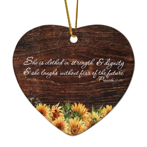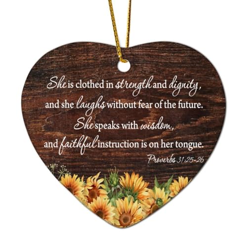She Is Clothed in Strength & Dignity Proverbs 31:25 Décoration en céramique en forme de cœur pour sapin de Noël à suspendre avec citations amusantes Décoration commémorative de Noël souvenir du Nouvel