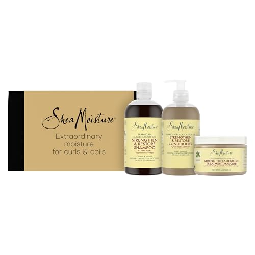 Shea Moisture Strengthening Set Shampooing, Après-shampoing et Soin Sans Rinçage, Coffret Cadeau pour Femmes, Amies et Mamans, Sans Sulfates, Lot de 3