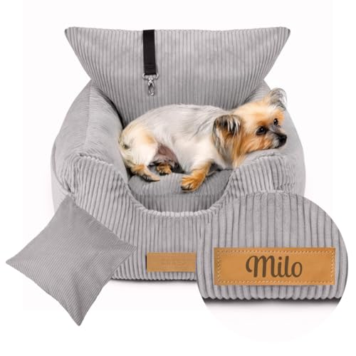 Petsen Siège Auto pour Chiens Petits et Moyens, Siège rehausseur, Poche de Rangement, Laisse de sécurité, Coussin Amovible, Lit + nom de Chien