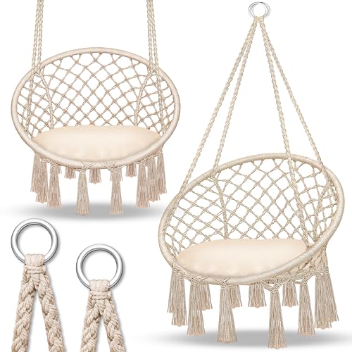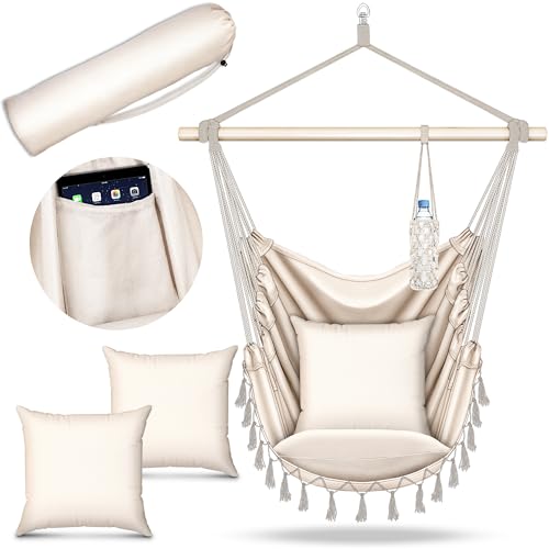 VOUNOT Chaise Suspendue en Coton Doux avec 2 Coussins Siège Suspendu Balançoire Suspendue pour Intérieur et Extérieur Hamac Portable à Franges Beige