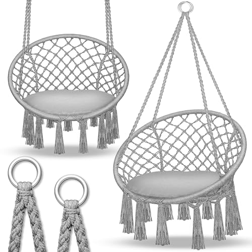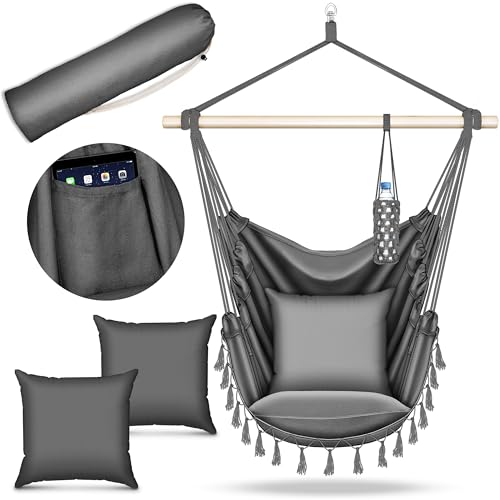 VOUNOT Chaise Suspendue en Coton Doux avec 2 Coussins Siège Suspendu Balançoire Suspendue pour Intérieur et Extérieur Hamac Portable à Franges Gris
