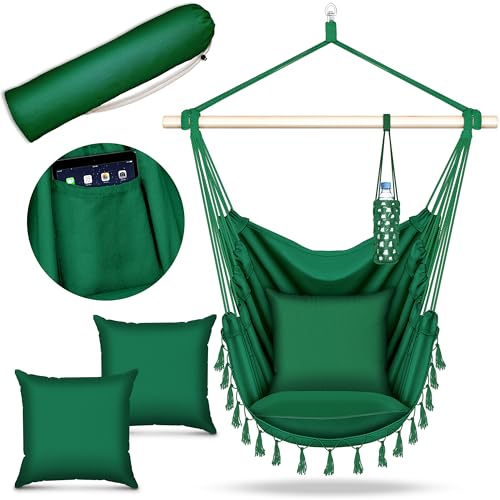 tillvex Hamac Chaise Suspendu 200kg | Chaise Relax à Franges - Intérieur et Extérieur | Hamac avec Coussins Confortables de Siége | Kit de Suspension (Vert, avec 2 Coussin)