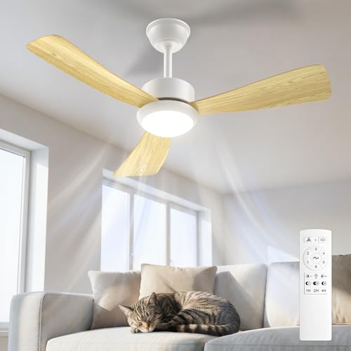 Mefine Silencieux Ventilateur Plafond avec Lumiere et Telecommande, 106cm Dimmable Lampe Ventilateur Plafond LED avec 5 Pales Doubles, Bois Clair/Blanc pour Chambre, Salon, Minuterie, 6 Vitesses