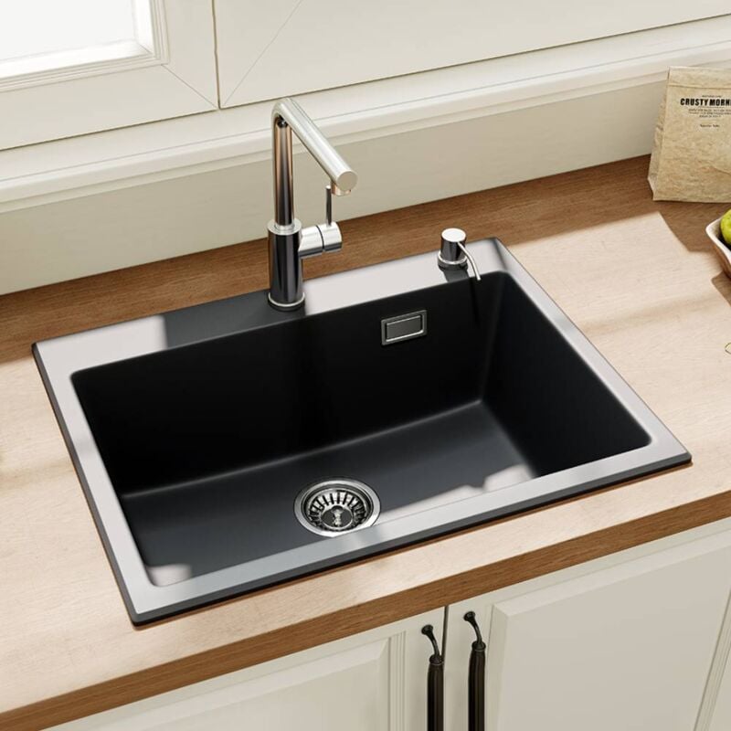 60x45 cm Évier de cuisine en granit encastrable - évier encastré, grand évier de cuisine à 1 bac avec siphon, évier noir avec trou pour robinet