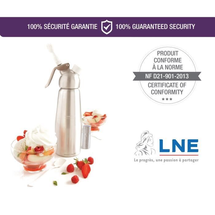 Mastrad – Lot Siphon 0,5L + Cartouches N2O – Préparez Mousses, Chantilly, Sauces & Espumas – Structure Aluminium Anodisé + Cartouches Alimentaires N2O – Accessoires Inclus – Conforme Norme AFNOR