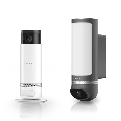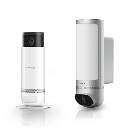 Bosch Kit de caméras de Surveillance intelligentes Smart Home, 1x caméra extérieure II Argent, 1x caméra intérieure II, résolution Full-HD avec sirène d'alarme intégrée, Compatible avec Amazon Alexa