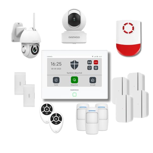 Daewoo Pack Alarme AM311, Centrale à écran Tactile, détecteur de Mouvement adapté aux Animaux, contacteurs de Porte, Vibration, sirène, caméra intérieure et extérieure rotative, contrôle à Distance
