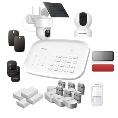 Alarme Daewoo SA804 Refuge - Système Complet Maison : Centrale, Détecteurs Ouverture et présence, Sirène Solaire, Télécommandes, Caméras Intérieure & Extérieure rotatives, Compatible Alexa & Google