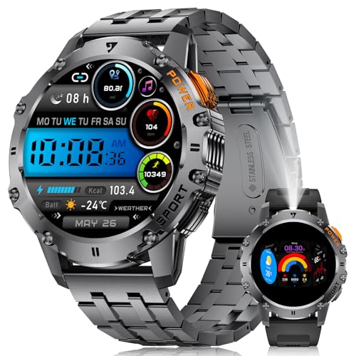 BENYAR SMART Montre Connectée Homme avec LED Lampe,Smartwatch Homme avec Moniteur de Fréquence Cardiaque et Sommeil/110+ Modes Sportifs,IP68 Étanche Android iOS,Noir Militaire Acier Inoxydable Montre