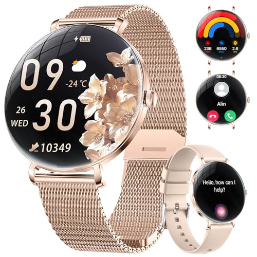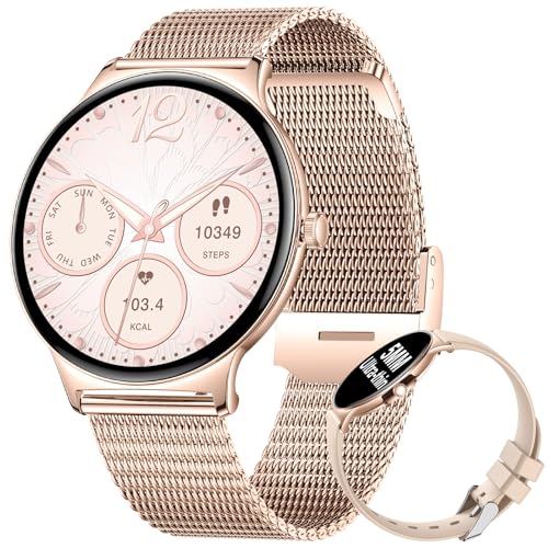 BENYAR SMART Montre Connectée Femme avec Appel Bluetooth, 1.43" HD AMOLED Ronde Smartwatch Femme, Fonction Féminine/100+ Modes Sport/Étanche IP68/Podomètre pour Android iOS, Bandeau en Maille Or Rose