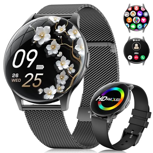 BENYAR SMART Montre Connectée Femme, 1.43" Ultra-Fin Écran AMOLED avec Appel Bluetooth, Santé Féminine, Étanche IP68, 110 + Modes Sportifs, Podomètre, Smartwatch Femme pour iOS Android, Maille Noire