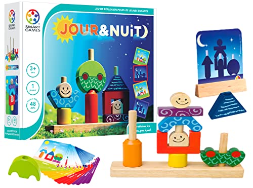 SmartGames - Jour et Nuit - Jeu de Réflexion en Bois - Reproduis Les Images Pas à Pas - 48 Défis de Niveaux Différents - 1 Joueur - pour Enfants à Partir de 3 Ans