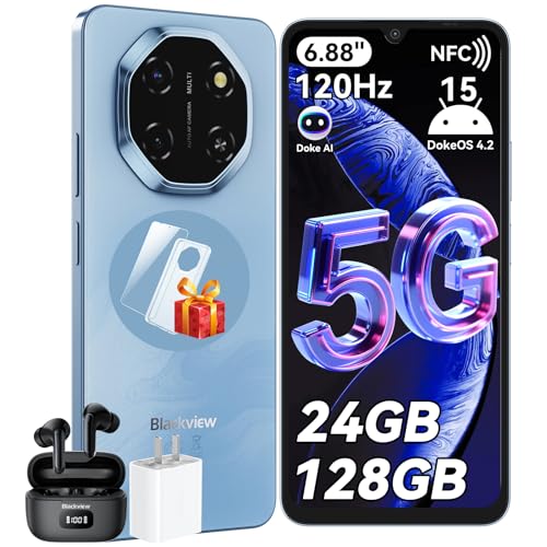 Blackview Shark 6 Smartphone 5G, Telephone Portable Pas Cher 6.88'' HD 120Hz, Android 15, Unisoc T8100, 24GB+128GB/2TB TF, 5000mAh, 16MP+8MP, 5G Dual SIM/OTG/NFC/Face ID/Fingerprint