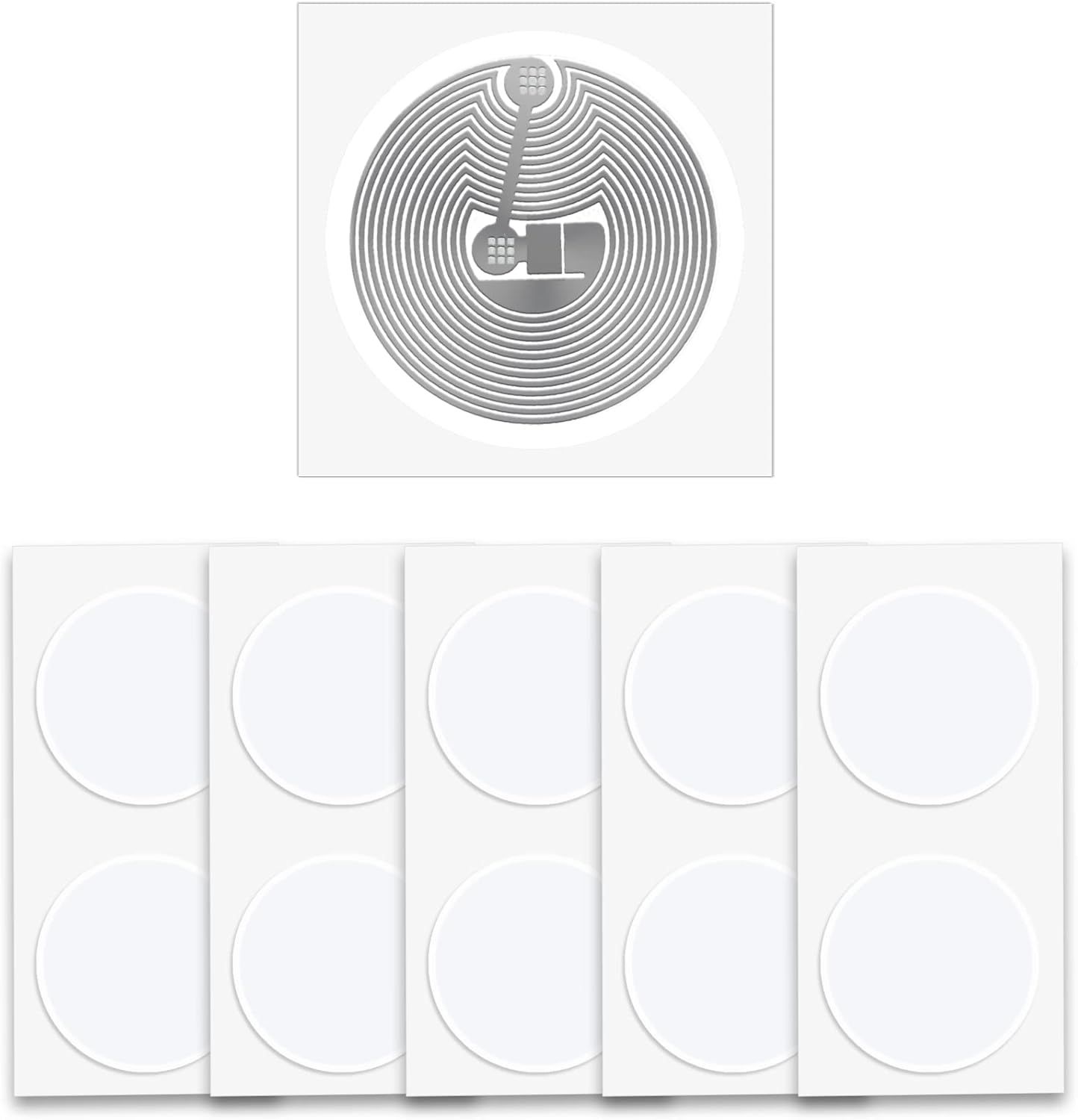 20 autocollants NFC avec puce NTAG215 originale. Compatible avec tous les smartphones dotés de NFC. RFID 13,56 MHz. Mémoire 540 octets. Tags Lire et écrire Smartphone