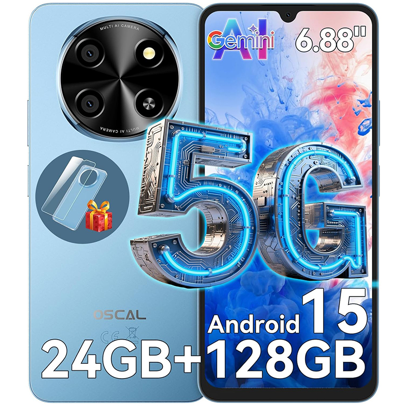 OSCAL Tiger 8 Telephone Portable 5G,24Go+128Go/2TB TF,Android 15 Smartphone,Octa-Core,NFC,Dual SIM,6.88" HD,5000mAh 15W Charge Rapide,Caméra AI,16MP+8MP,ID De Visage,Empreinte Digitale,Bleu