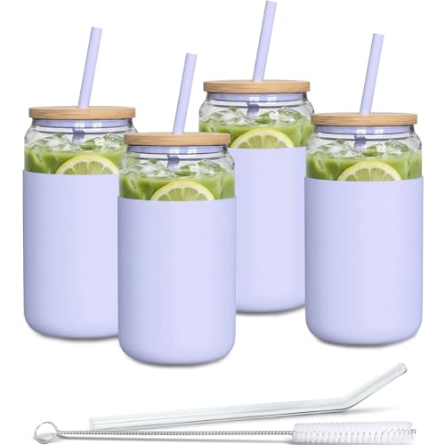 BUCOMTU Lot de 4 bouteilles en verre graduées de 500 ml, gobelets à smoothie avec couvercle en acier inoxydable, bouteilles d'eau en verre réutilisables, adaptées aux smoothies, jus, lait, café