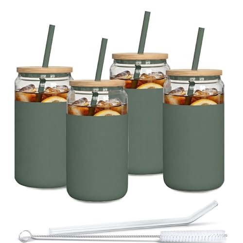 YBCPACK Lot de 4 bouteilles en verre à remplir, 300 ml, avec couvercle en acier inoxydable, gobelets à smoothie, gradués, réutilisables, à remplir pour jus, lait, café glacé, passent au lave-vaisselle