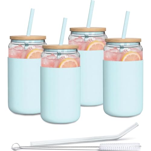 Aquafloow Verre avec Paille et Couvercle 500 ml | Gobelets réutilisables Housse en Silicone | Set de Verres- 2 pailles 1 bâtonnet de nettoyage | Pour smoothie, café, cocktail- 4 pièces- Bleu