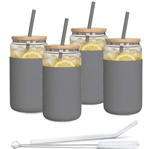 Aquafloow Verre avec Paille et Couvercle 500 ml | Gobelets réutilisables Housse en Silicone | Set de Verres- 2 pailles 1 bâtonnet de nettoyage | Pour smoothie, café, cocktail- 4 pièces- Gris