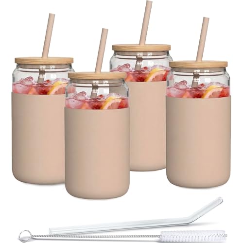 Aquafloow Verre avec Paille et Couvercle 500 ml | Gobelets réutilisables Housse en Silicone | Set de Verres- 2 pailles 1 bâtonnet de nettoyage | Pour smoothie, café, cocktail- 4 pièces- Beige