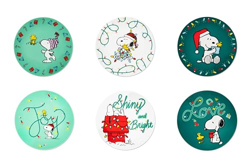 Excelsa Peanuts Shiny & Bright Lot de 6 assiettes à dessert, porcelaine, vert et blanc, 20,5 cm, set de Noël avec Snoopy, pour gâteaux et petit-déjeuner