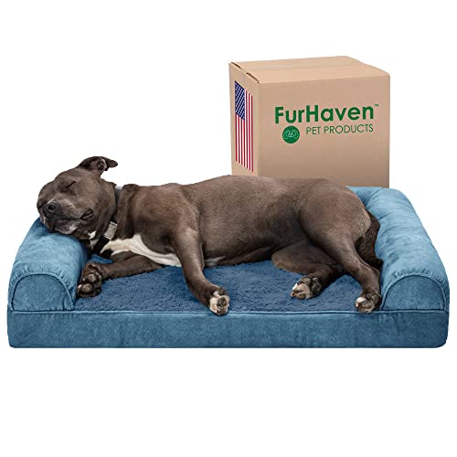Furhaven Large Orthopedic Dog Bed Faux Fur & Velvet Sofa-Style w/Removable Washable Cover - Harbor Blue, Large
