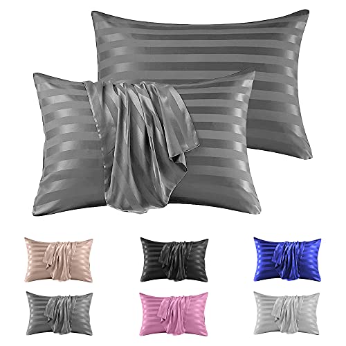 Lot de 2 taies d'oreiller en satin de soie à rayures - 50 x 75 cm - Pour le soin des cheveux et de la peau - Avec enveloppe - Gris foncé