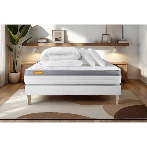 Pack matelas + sommier 140x190 Memo Spring Ressorts ensachés 3 zones MAXI épaisseur + Couette + 2 oreillers blanc 140 x 190 cm