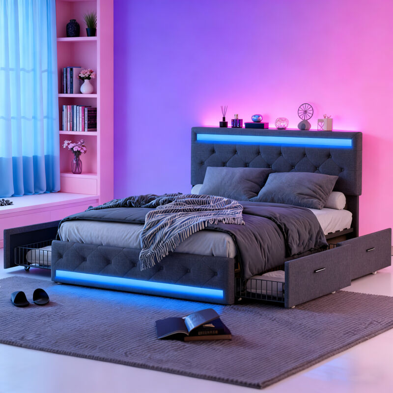 Lit 140x190 cm avec 4 Tiroirs Coulissants de Rangement - LED et Prise USB+Tpye C - Tête de Lit Rembourrée Réglable - Sommier à Lattes en Bois - 2