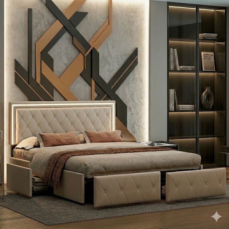 BSMGSGN-Lit Coffre 140x190 avec LED, 4 Tiroirs de Rangement, Tête de Lit Capitonnée, Ports USB et Type-C, Sommier à Lattes, Lit Double Rembourré en