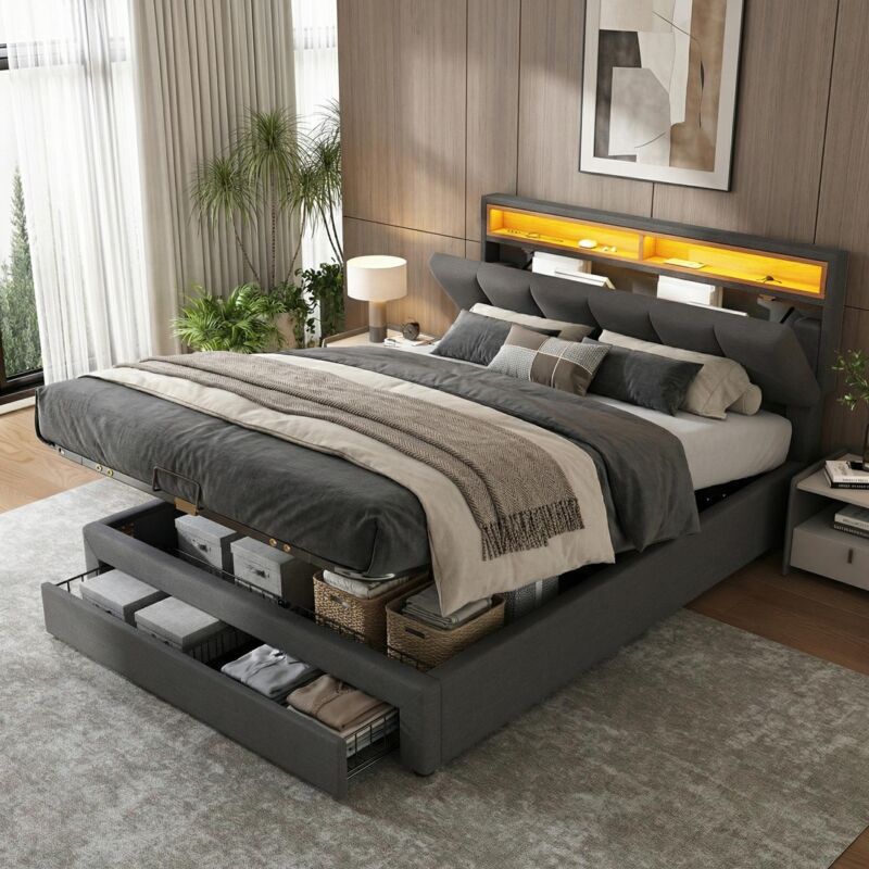 lit coffre 140x190 cm, lit double 140x190 avec LED et USB, lit hydraulique avec tiroirs, tête de lit en bois et rangement, sommier à lattes, gris, lin