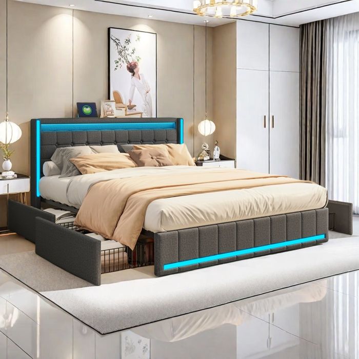 Lit 140x190 cm avec sommier a lattes Cadre de lit rembourré avec lumières LED et 4 tiroirs Lit double 140x190 cm en lin gris