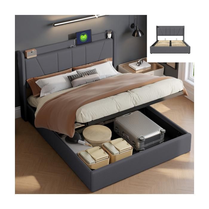 Lit coffre 160x200 cm - ADWOLT - Gris - 2 ports USB - Mécanisme à ressort à gaz - Sommier inclus