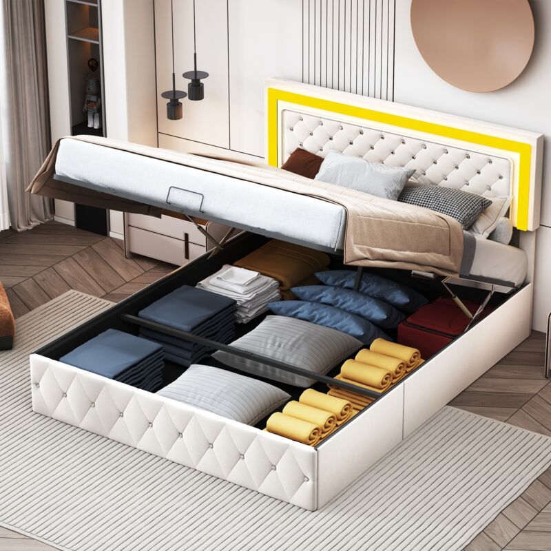 Dans Les Nuages - Lit coffre 160x200 cm, avec éclairage led, hydraulique de rangement, sommier à lattes en bois, cadre en métal, lit capitonné en lin