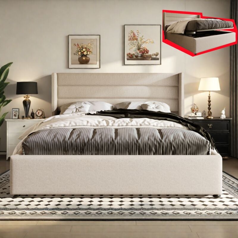 Lit coffre 160x200 cm, avec hydraulique de rangement, 2 tiroirs, sommier à lattes en bois, cadre en métal, lit capitonné en lin - Beige