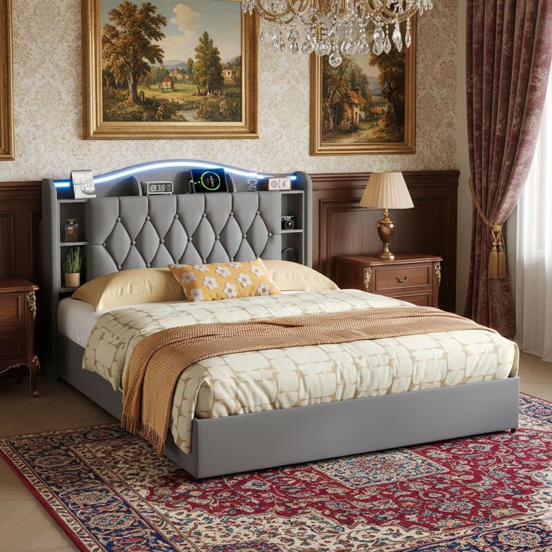 Dans Les Nuages – Lit coffre 160x200 cm avec éclairage LED – Rangement hydraulique – USB-A/C charge – Sommier à lattes en bois – Cadre métal