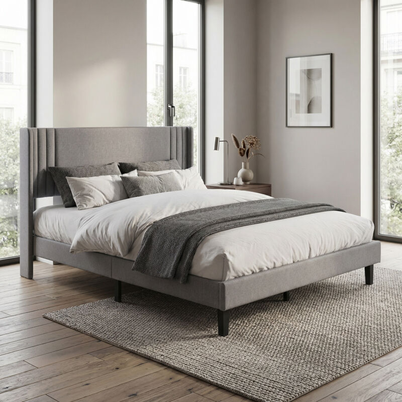 Lit adulte 160x200 avec sommier silencieux, lit double avec structure en métal et bois, tissu en lin, design moderne scandinave, Gris