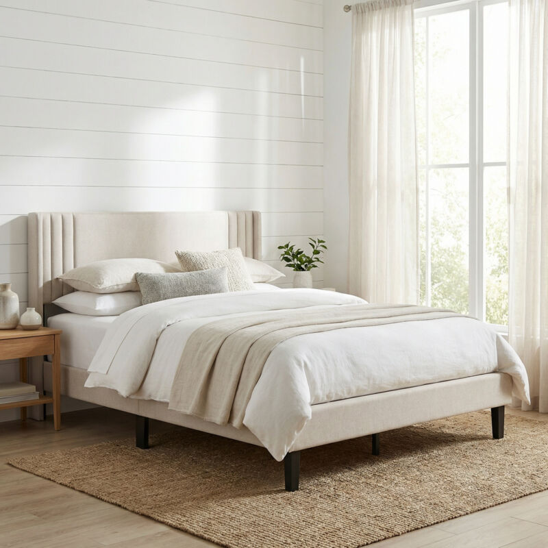 Lit adulte 160x200 avec sommier silencieux, lit double avec structure en métal et bois, tissu en lin, design moderne scandinave, Beige