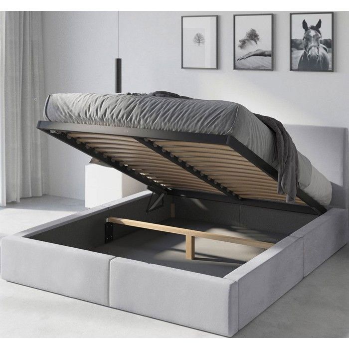 Lit double tapissé- Interbeds- Hilton -160x200 - Coffre de rangement – Sommier- Cadre en metal- Tête de lit -Tissu (gris)