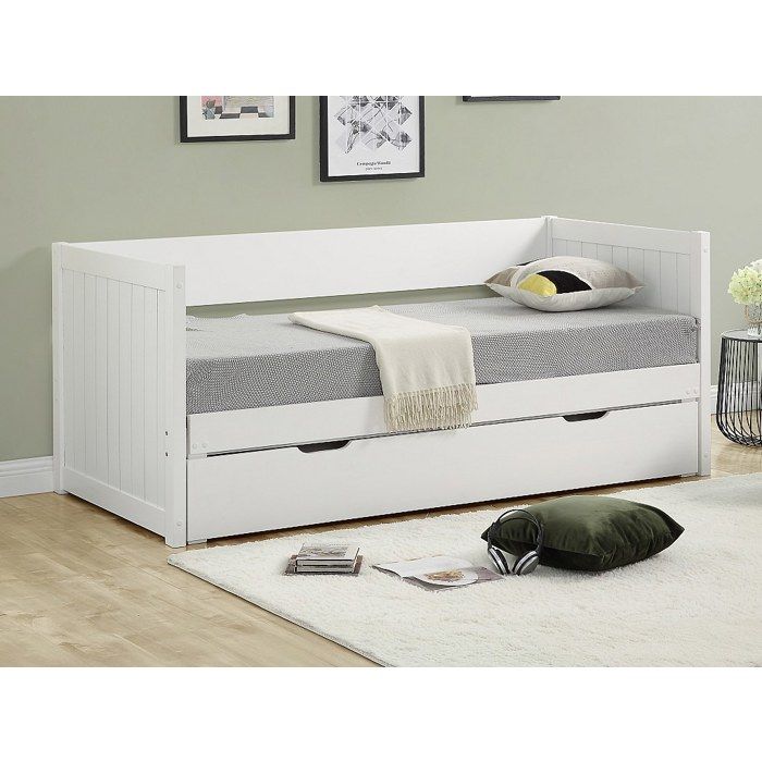Vente Unique Lit gigogne banquette 90 x 190 ou 180 x 190 cm Avec sommier peigne et tiroirs Pin et MDF Blanc Matelas DINIVA
