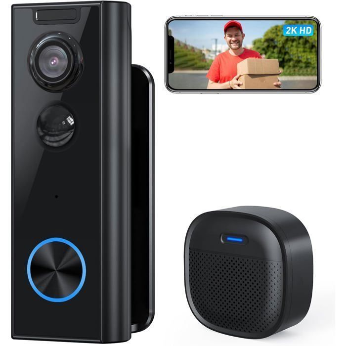 2K Sonnette sans Fil avec Camera avec Support dangle De Sonnette Réglable Sonnette Vidéo Détection PIR WiFi 24G 64go