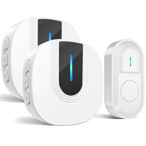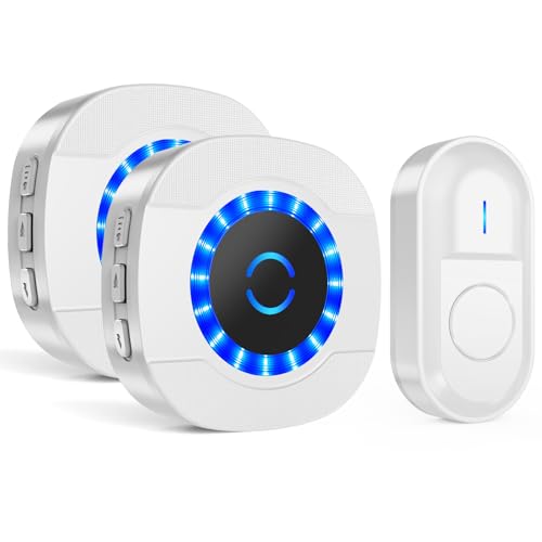 SURFOU Sonnette sans Fil Exterieur Etanche, 300M Sonnette de Porte, Étanche Electronique Kit de Carillon avec 2 Récepteurs Enfichables pour la Maison, 55 Mélodies, 5 Niveaux Volumes, LED Bleu